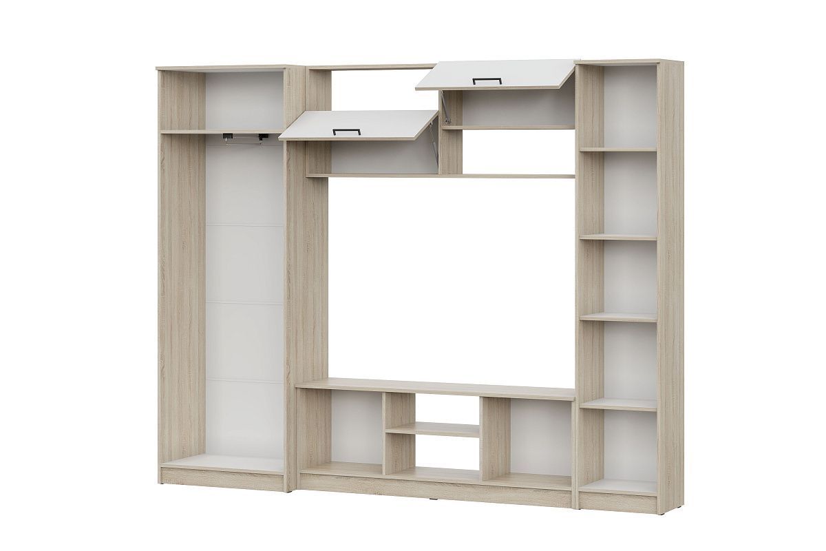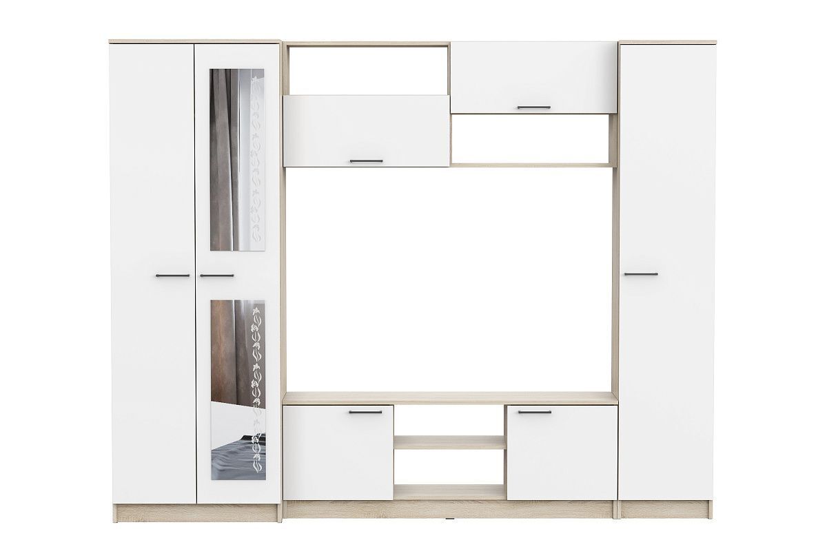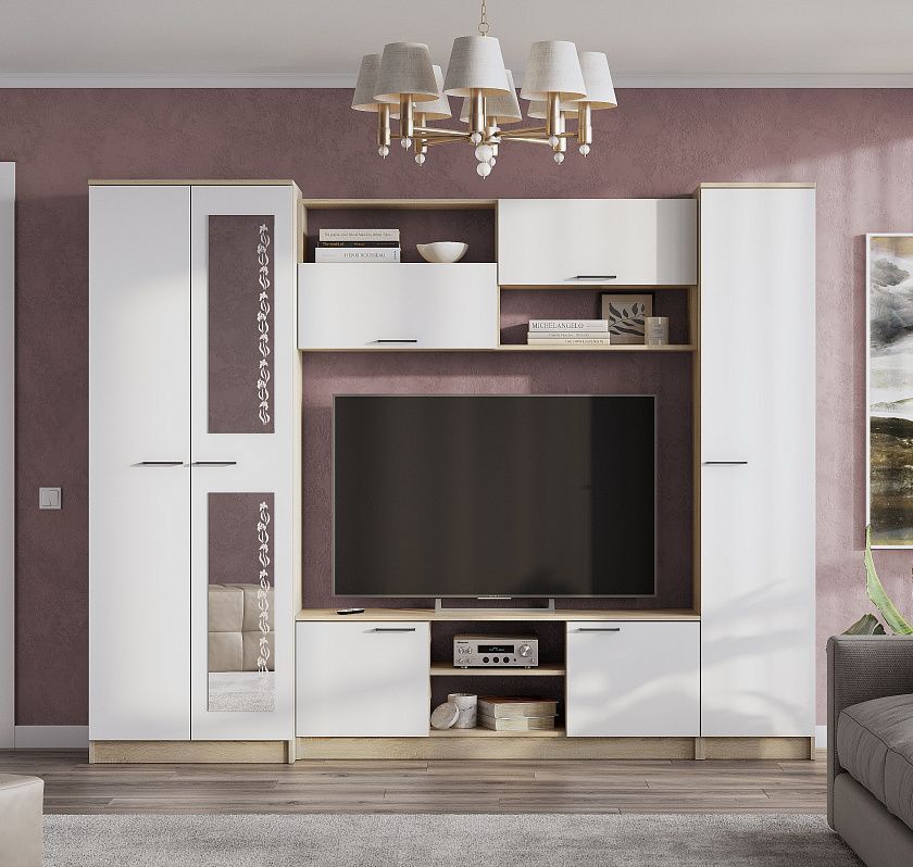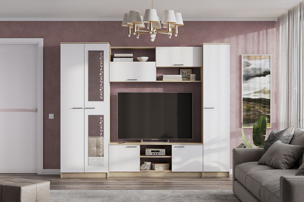 Белая гостиная со шкафом и с зеркалом МГ3 - это идеальное решение для тех, кто хочет создать современную и стильную атмосферу в своем доме или на даче. Этот комплект мебели состоит из шкафа для одежды, шкафа-витрины, шкафа-пенала и тумбы под ТВ, которые будут служить вам долгие годы.