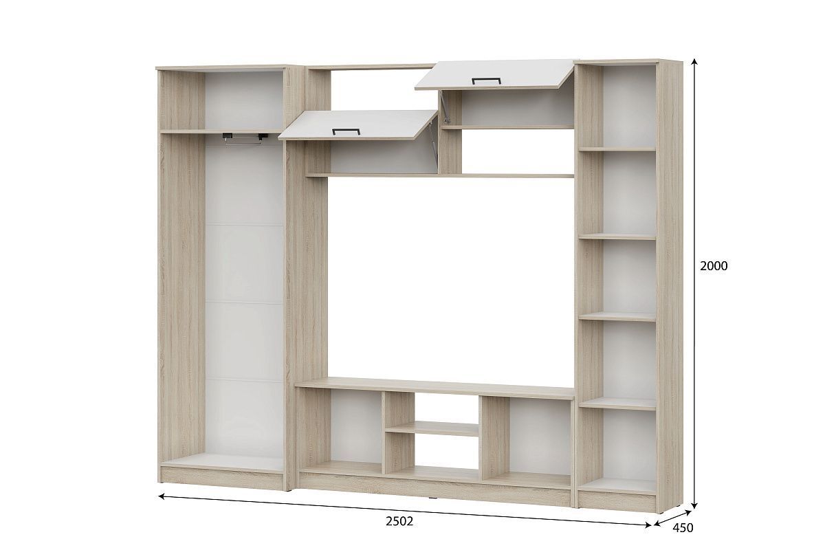 Ширина этого комплекта составляет 250 см, высота - 200 см, глубина - 45 см. Материал корпуса - ЛДСП, что обеспечивает высокую прочность и долговечность мебели.