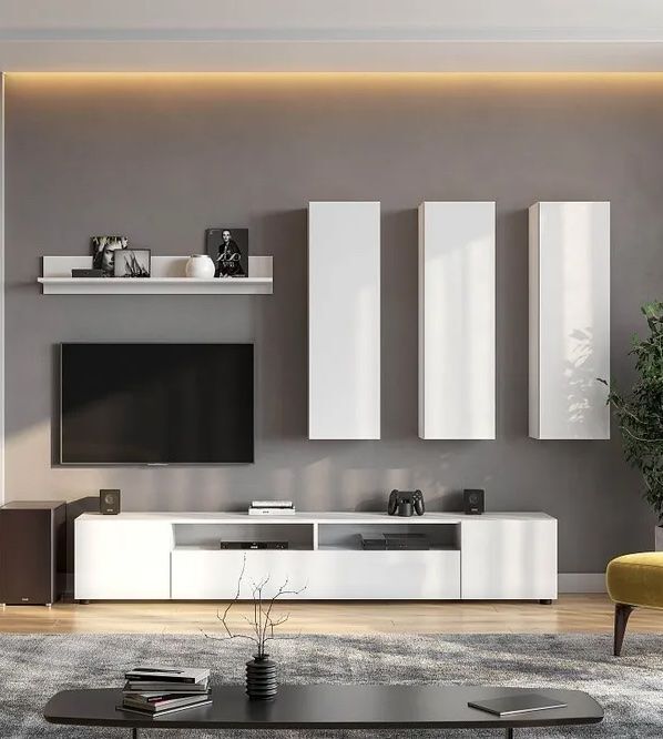 Все эти элементы вместе образуют красивую и функциональную стенку для гостиной, которая будет служить вам долгие годы.