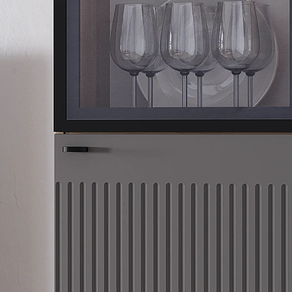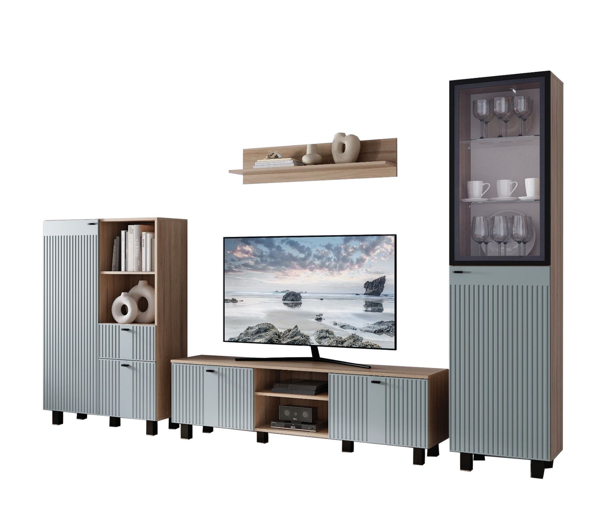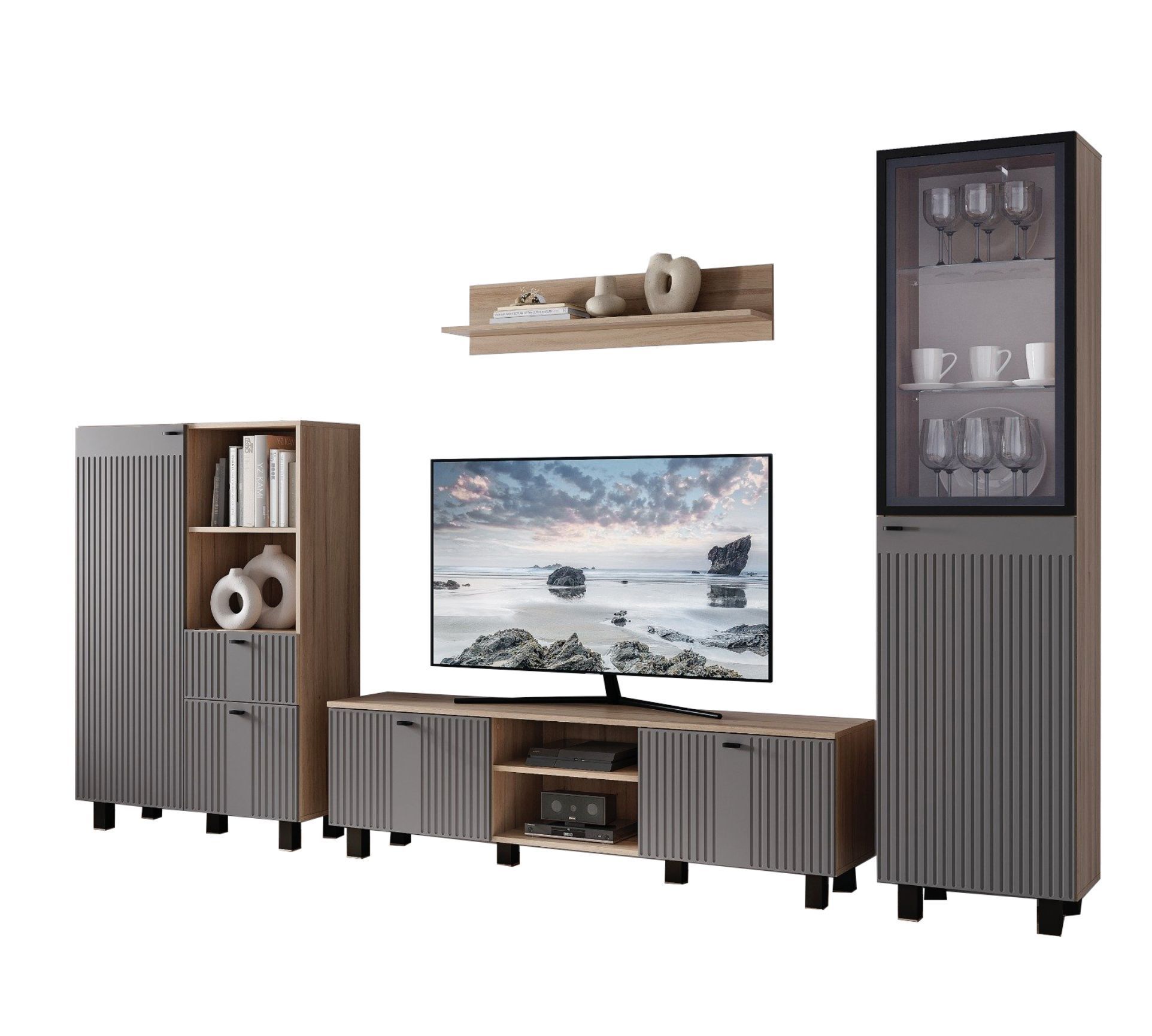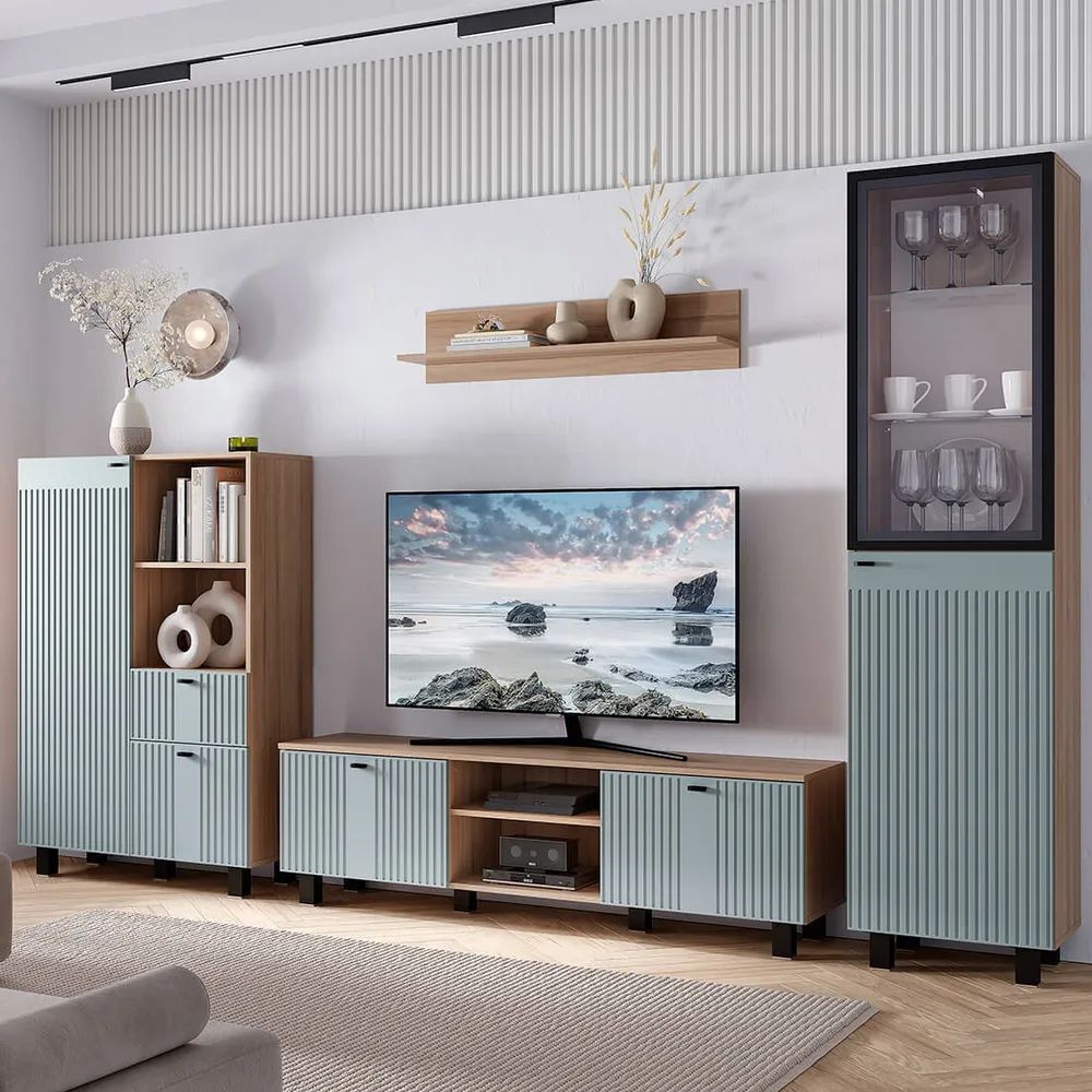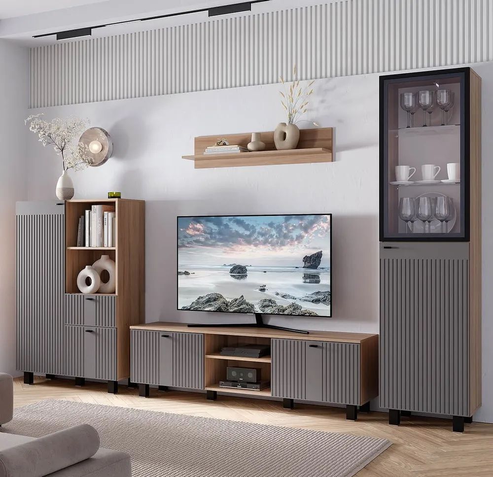 Гостиная "Олива" состоит из шкафа-витрины, комода, тумбы под ТВ и настенной полки. Это позволяет вам хранить все необходимое в одном месте и легко получить доступ к нему.