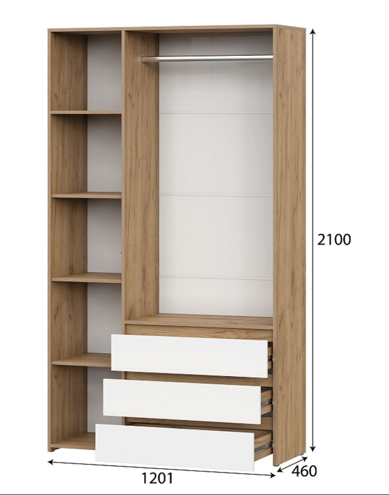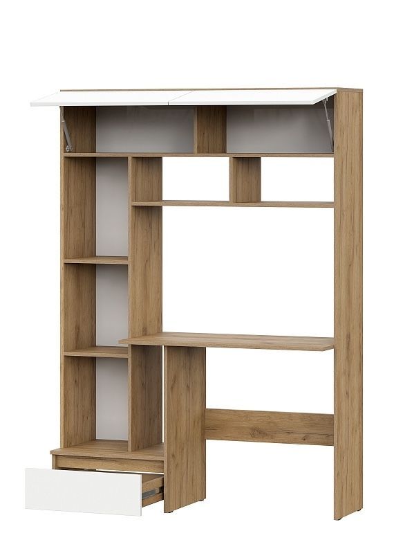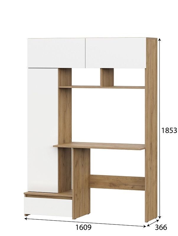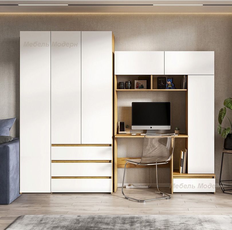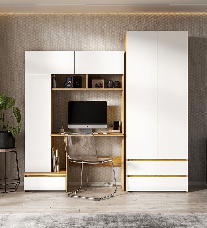 Корпус мебели изготовлен из высококачественного ЛДСП, который отличается прочностью и долговечностью. Цветовая гамма - белый с акцентами дубового золотого оттенка - создаст уютную и гармоничную атмосферу в детской комнате.