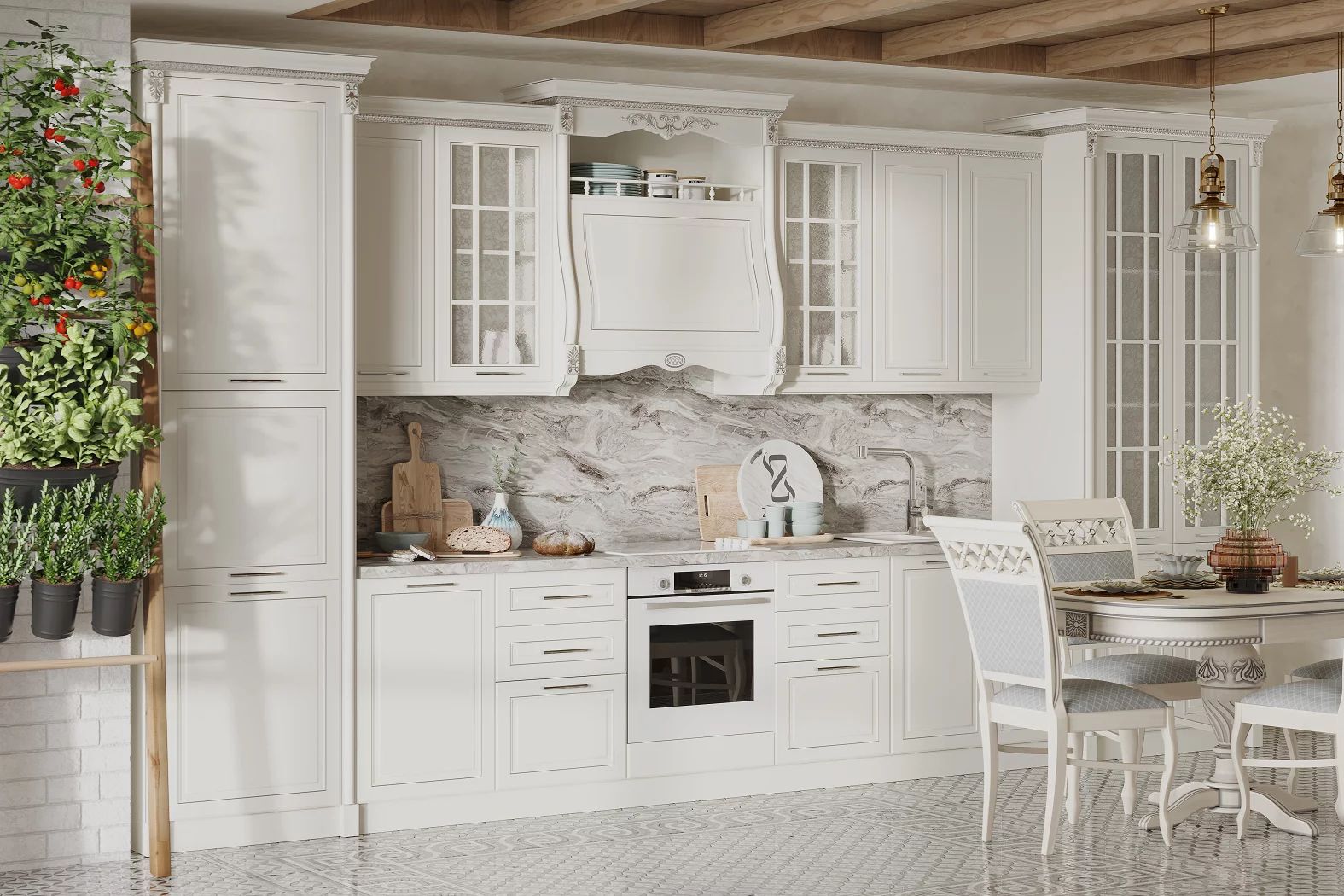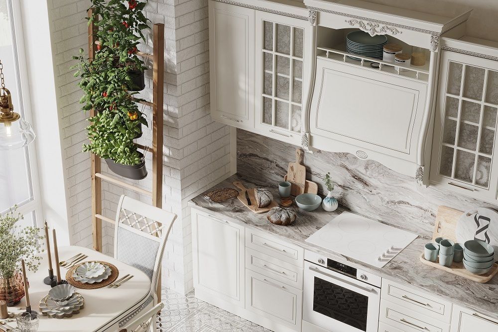 Стеновая панель (фартук) в цвет столешницы с соединительными планками и плинтусом Посудосушитель с поддоном