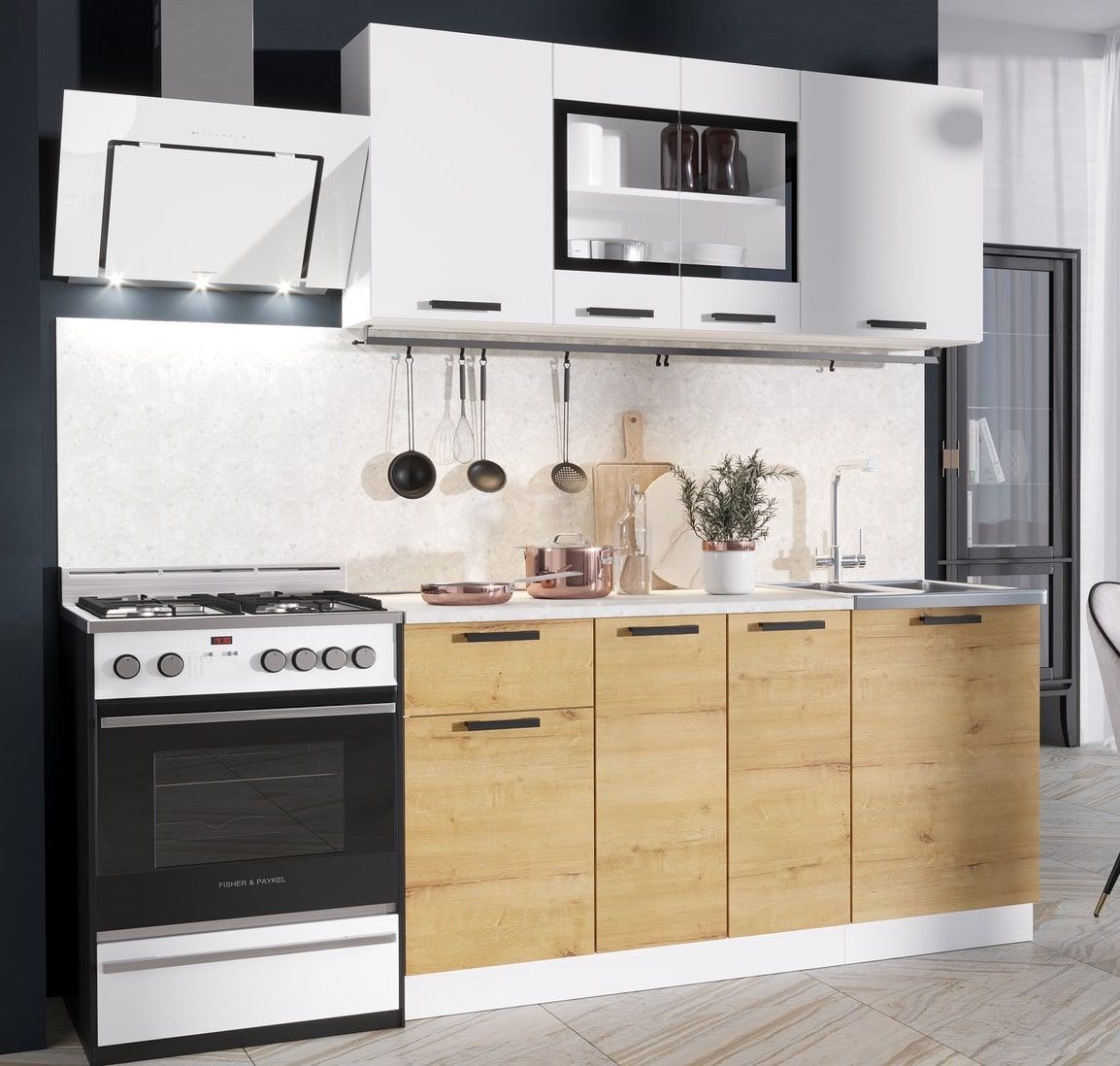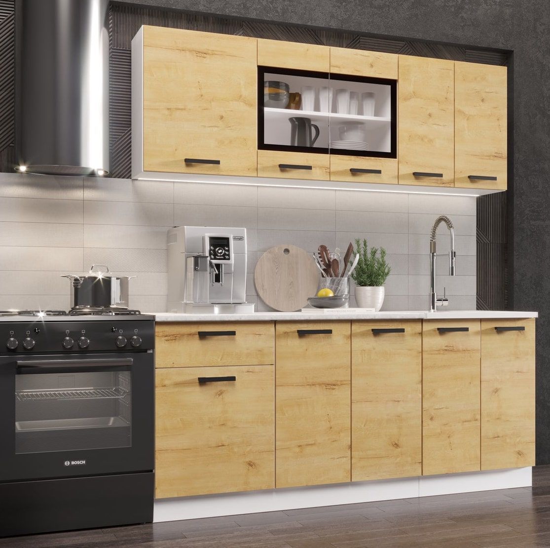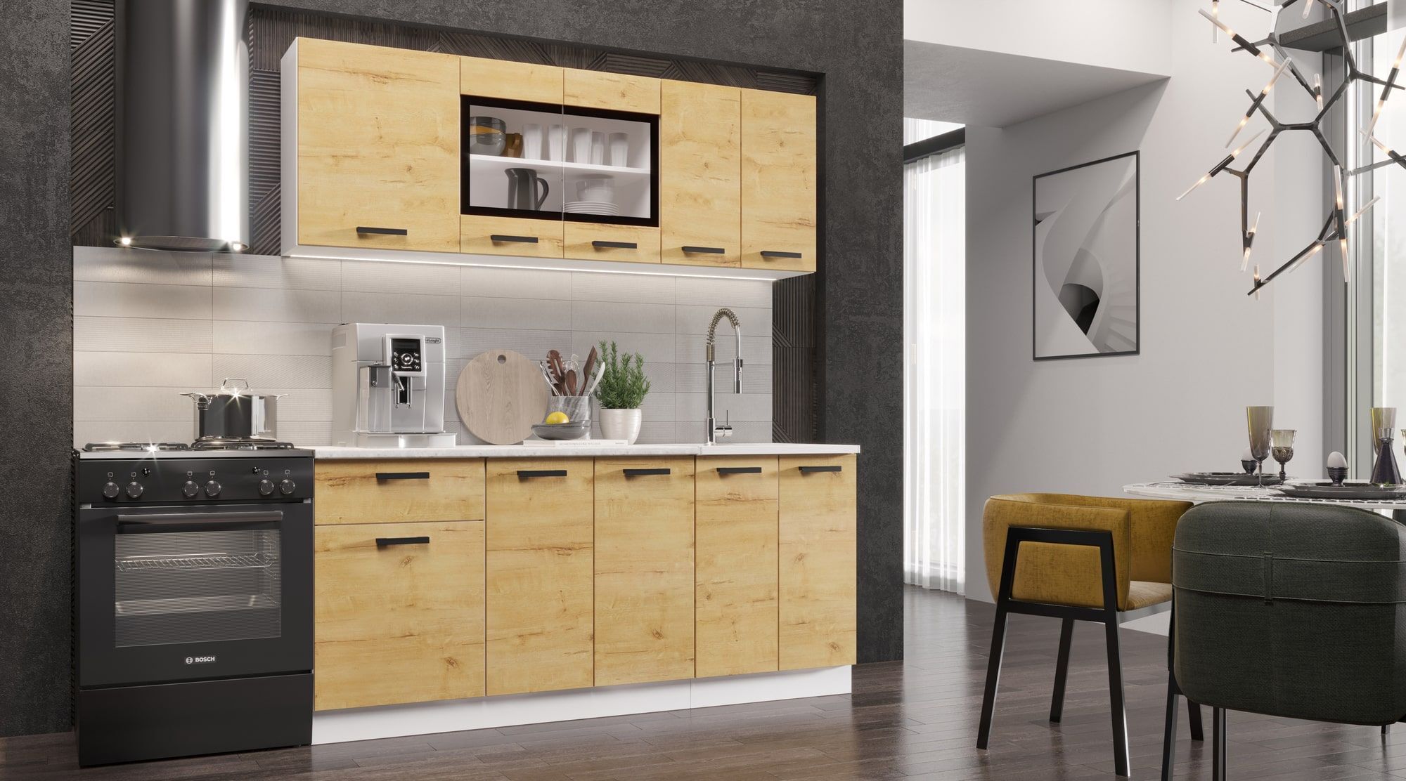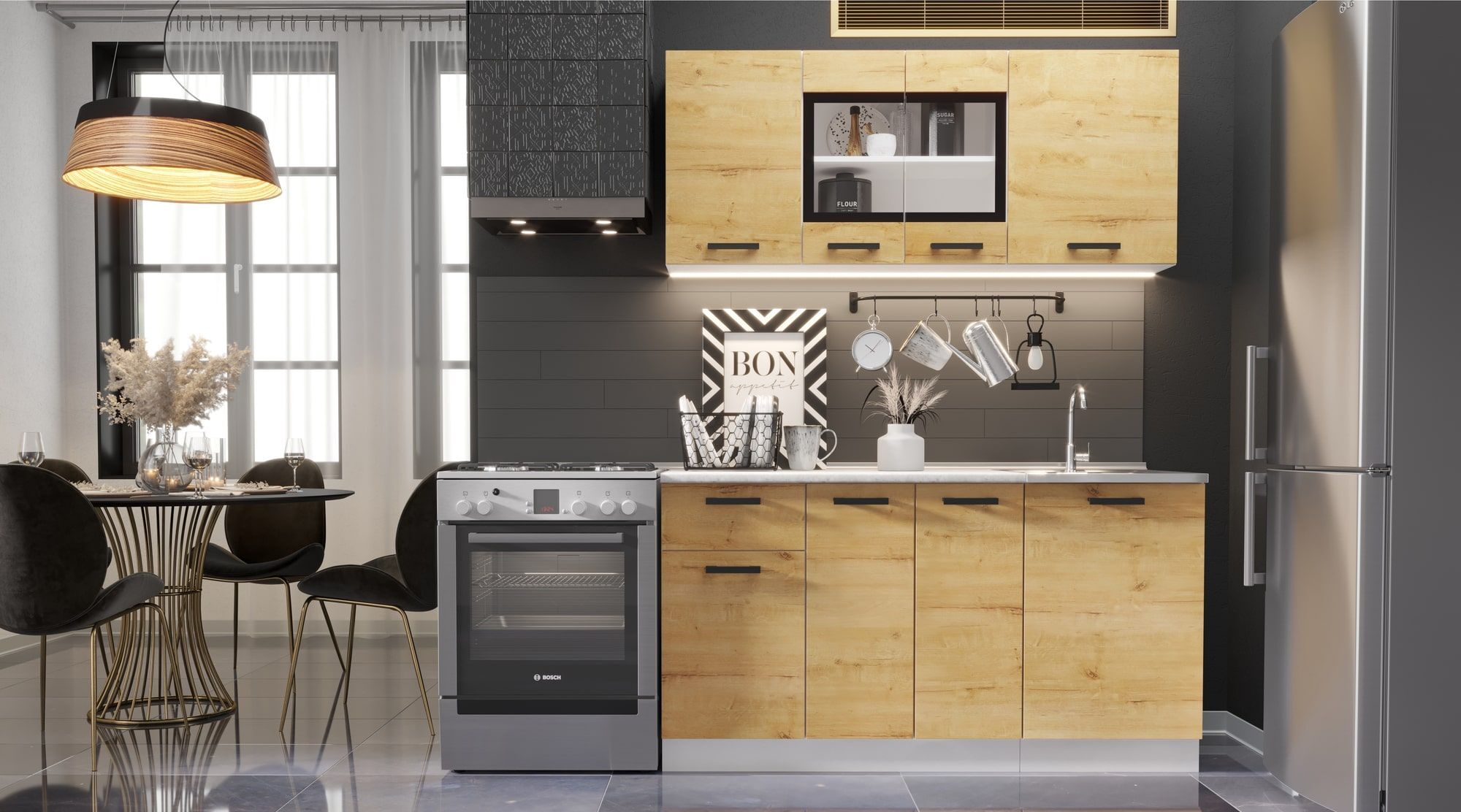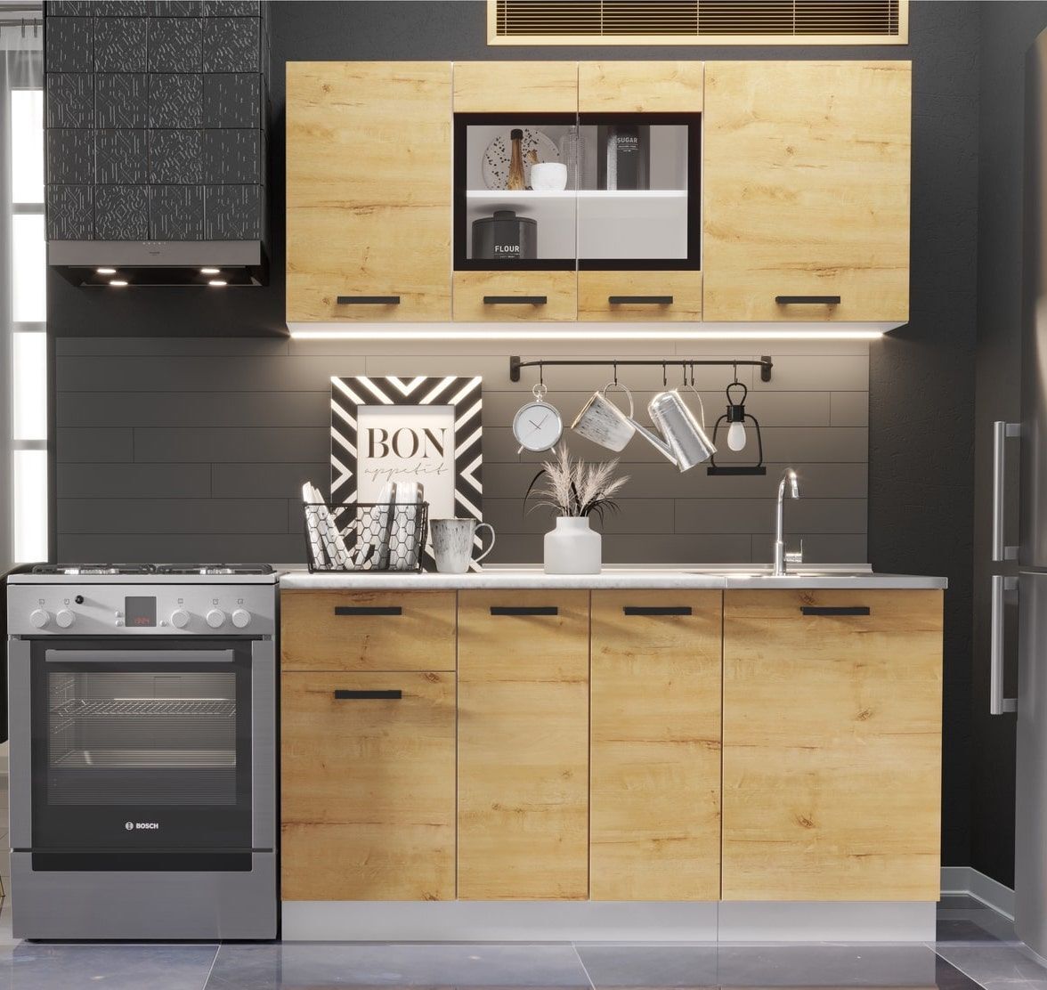 Стильный и практичный кухонный гарнитур Хозяюшка 150 см идеально подходит для небольших помещений. Шкафы и столы оснащены необходимым количеством отделений и полок, где вы сможете разместить бытовые и столовые принадлежности.