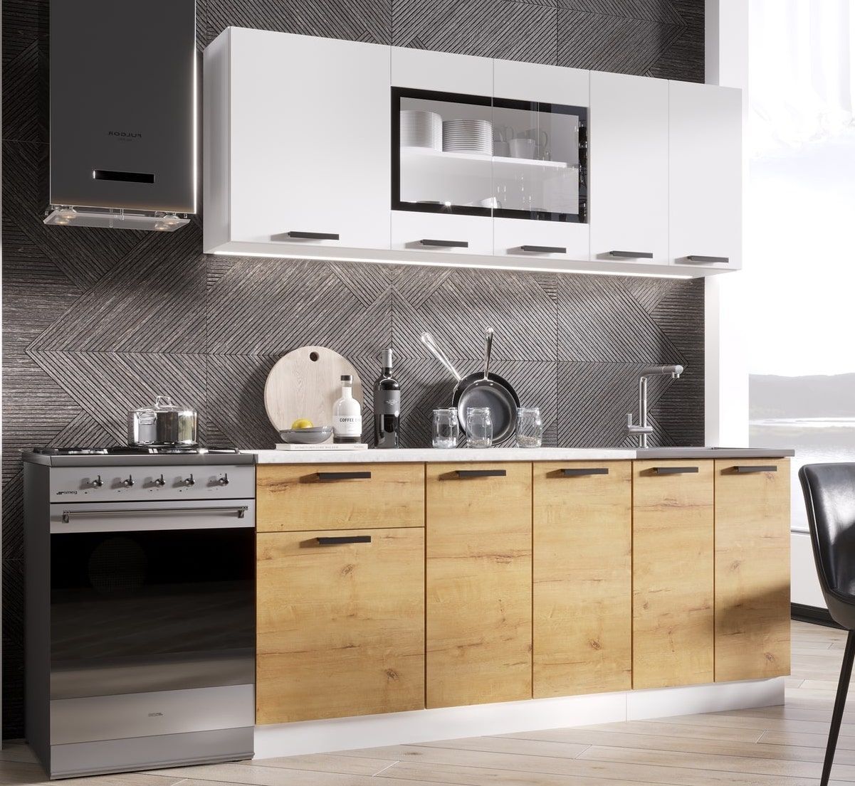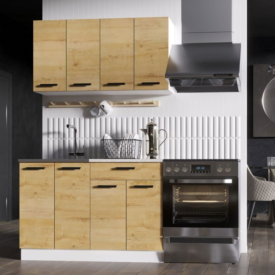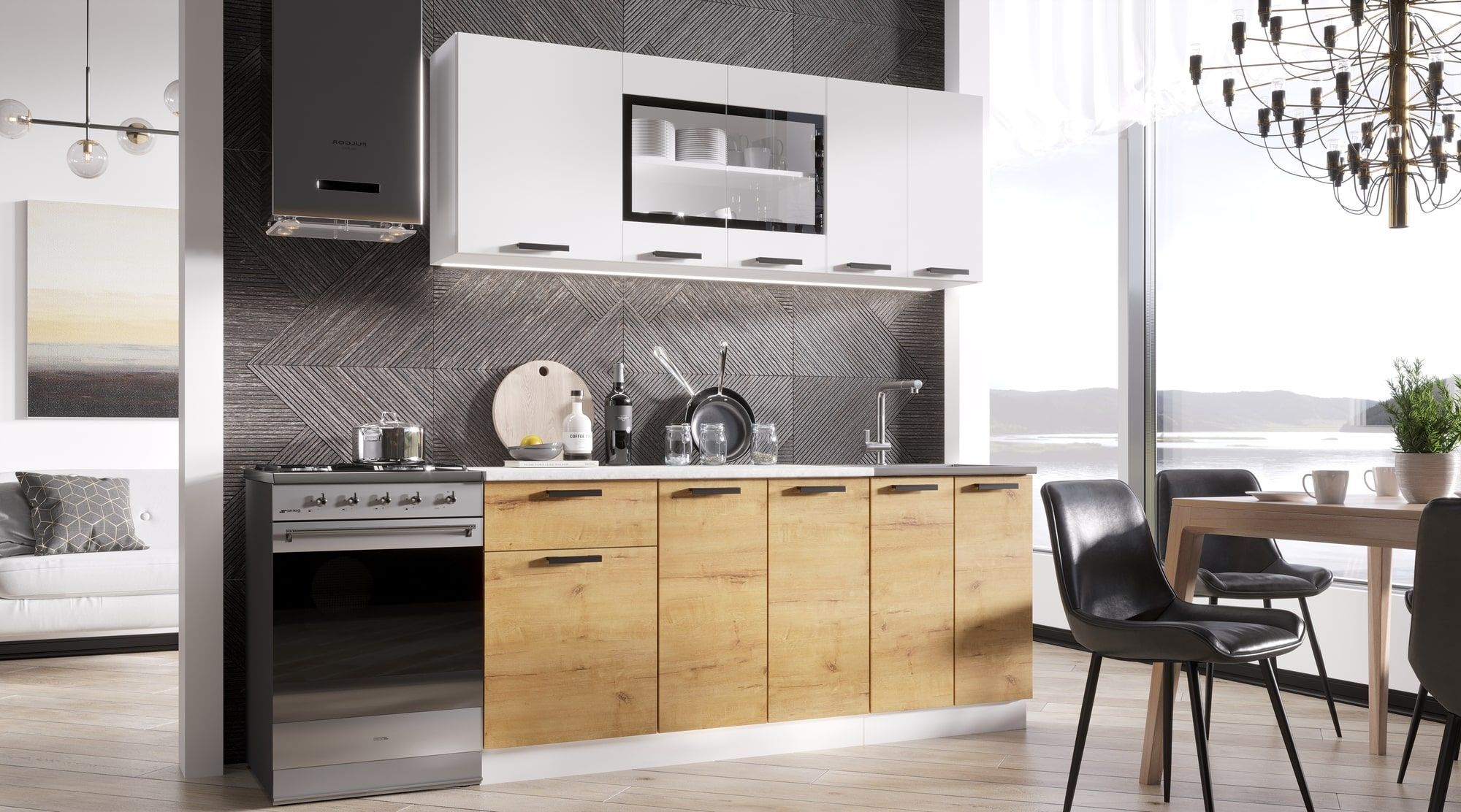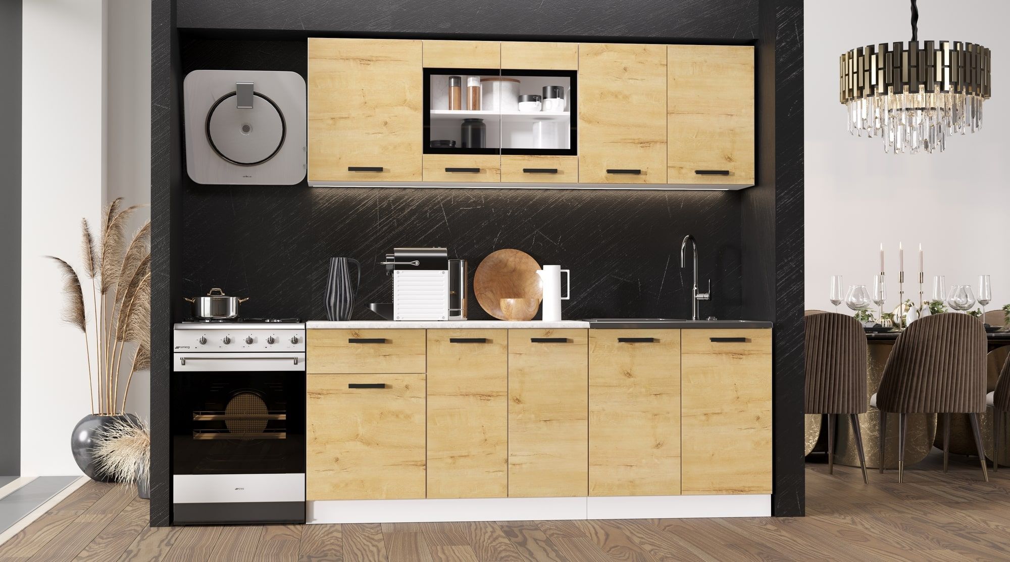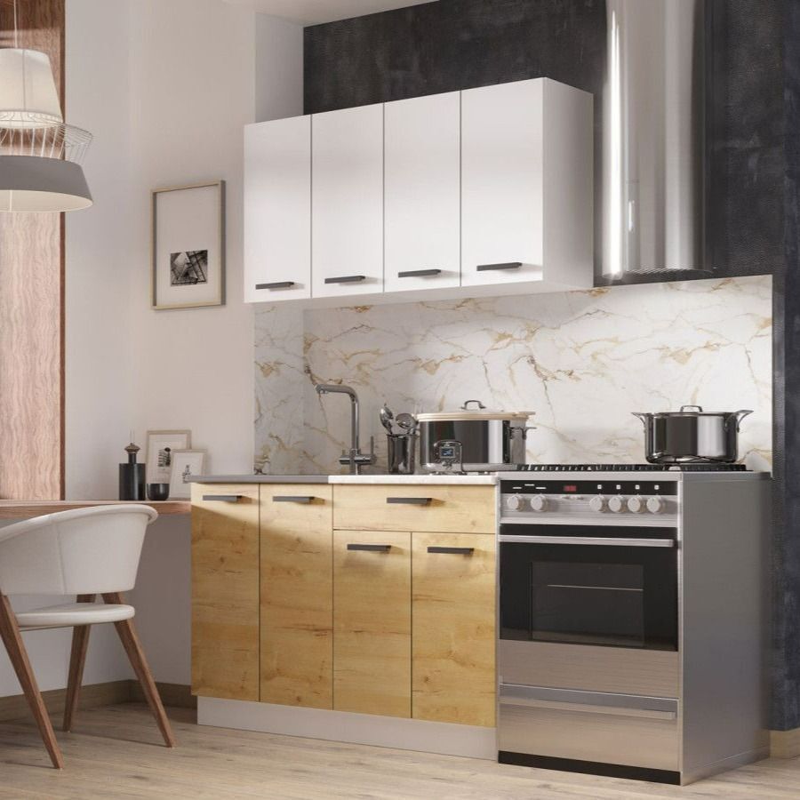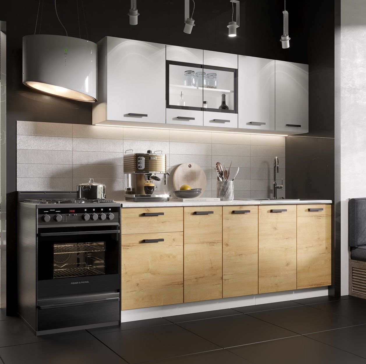 Стильный и практичный кухонный гарнитур Хозяюшка 150 см идеально подходит для небольших помещений. Шкафы и столы оснащены необходимым количеством отделений и полок, где вы сможете разместить бытовые и столовые принадлежности.