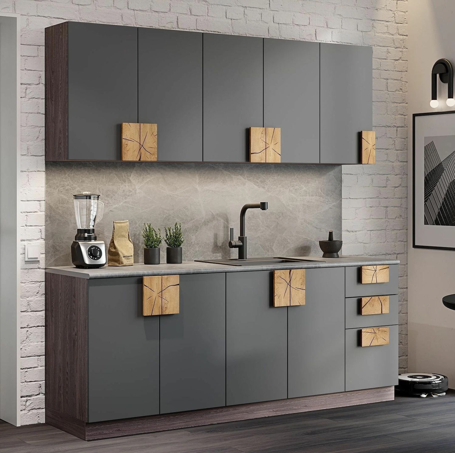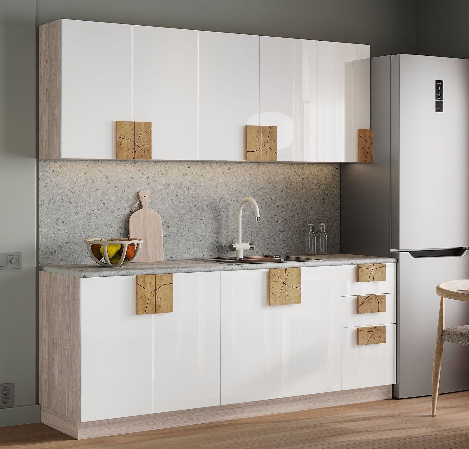 Кухня 2 метра выполнена без фурнитурных элементов на фасадах.