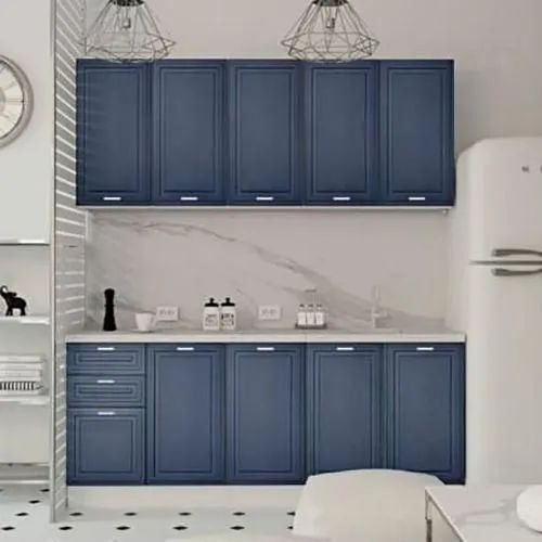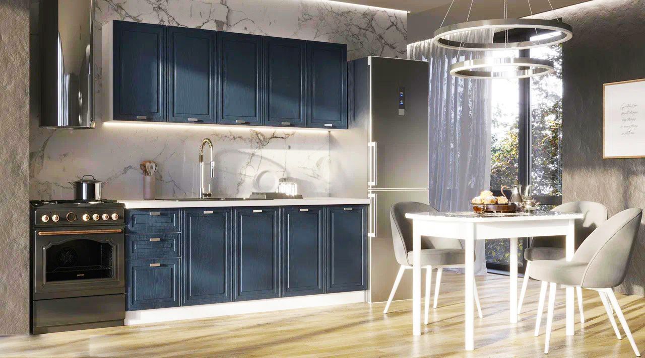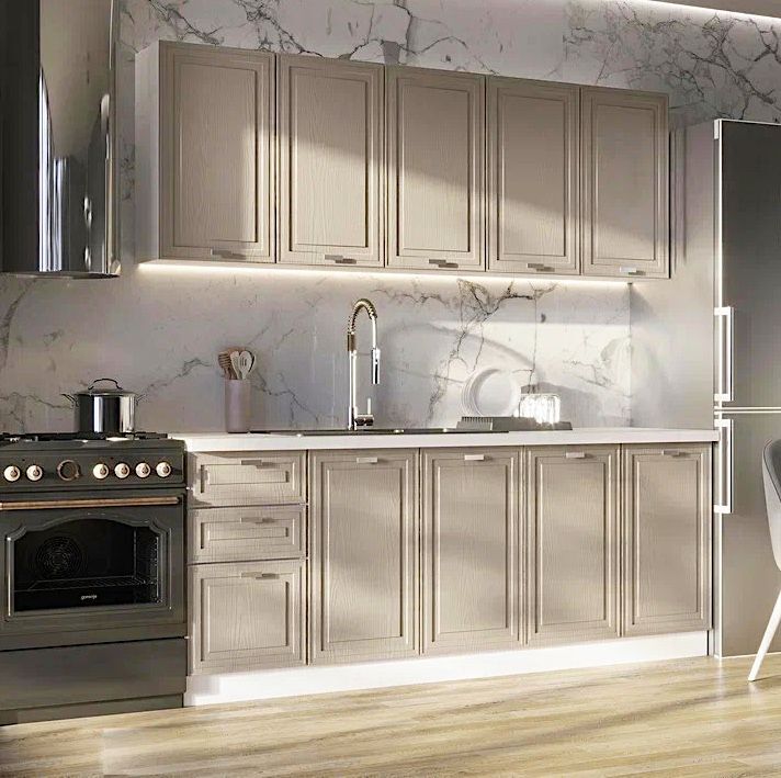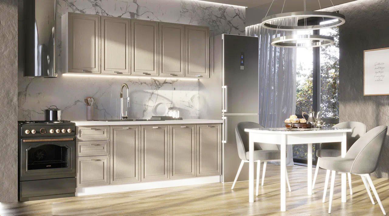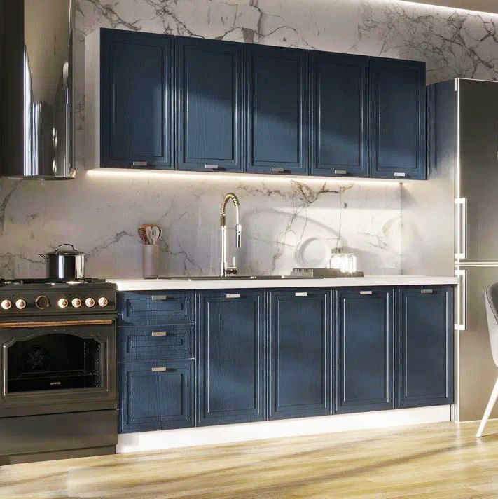 Кухня 2 метра выполнена без фурнитурных элементов на фасадах. Открывание дверей и ящиков производится за счет пространства между планками и фасадами.