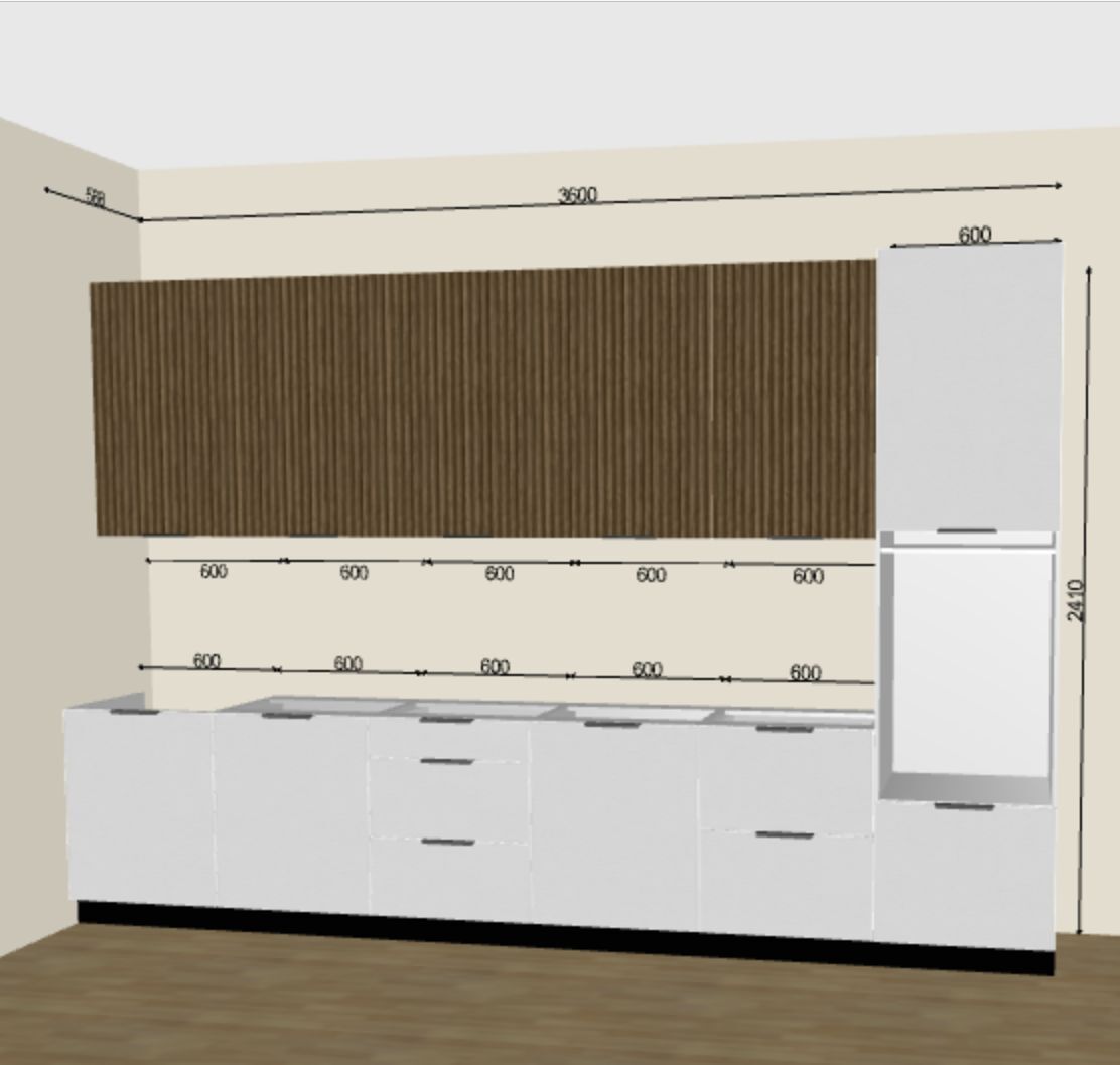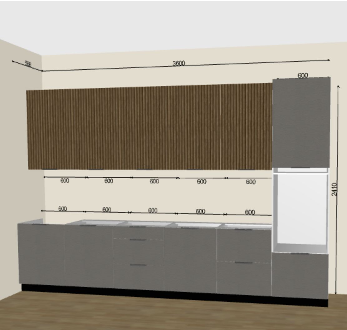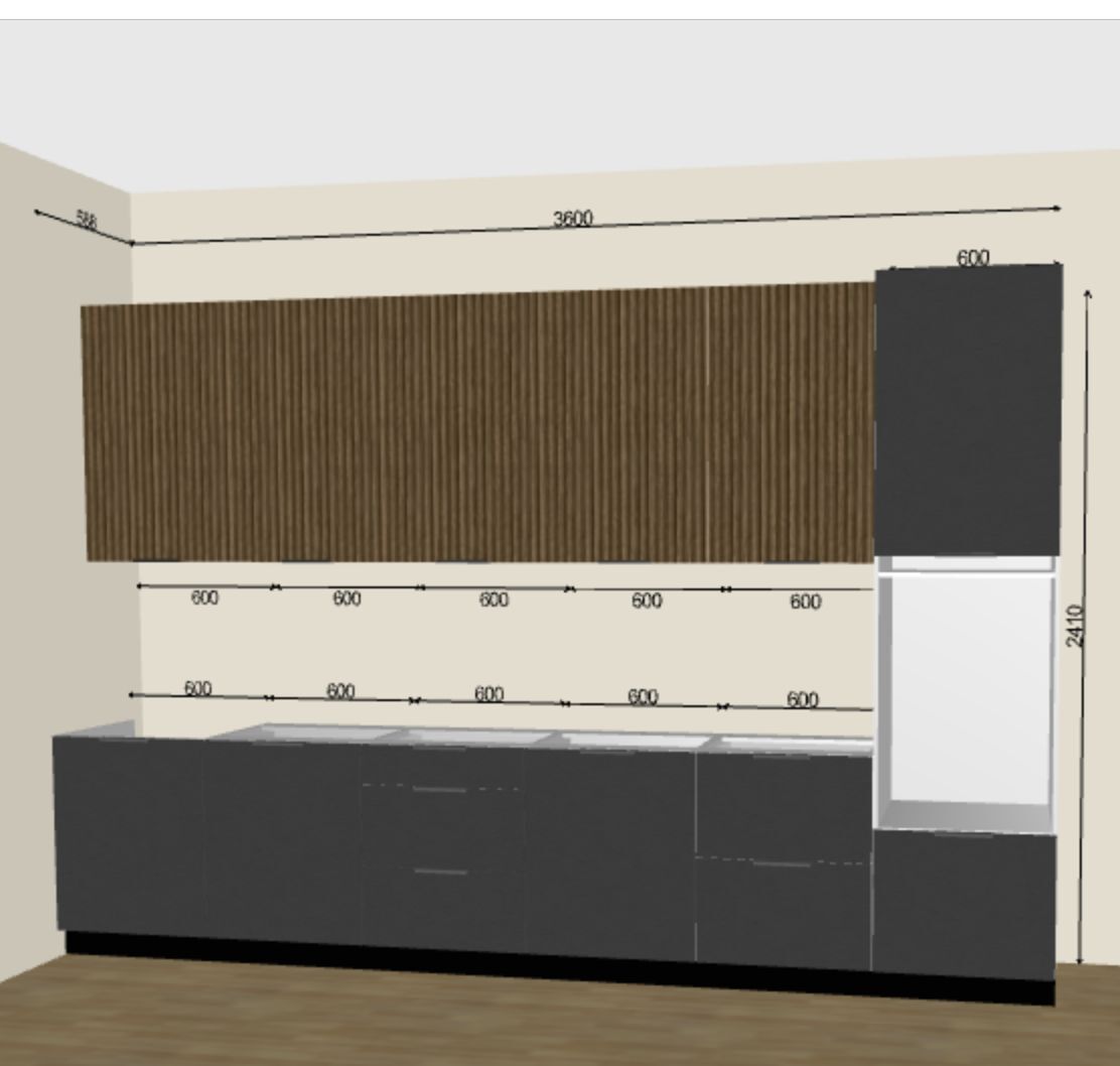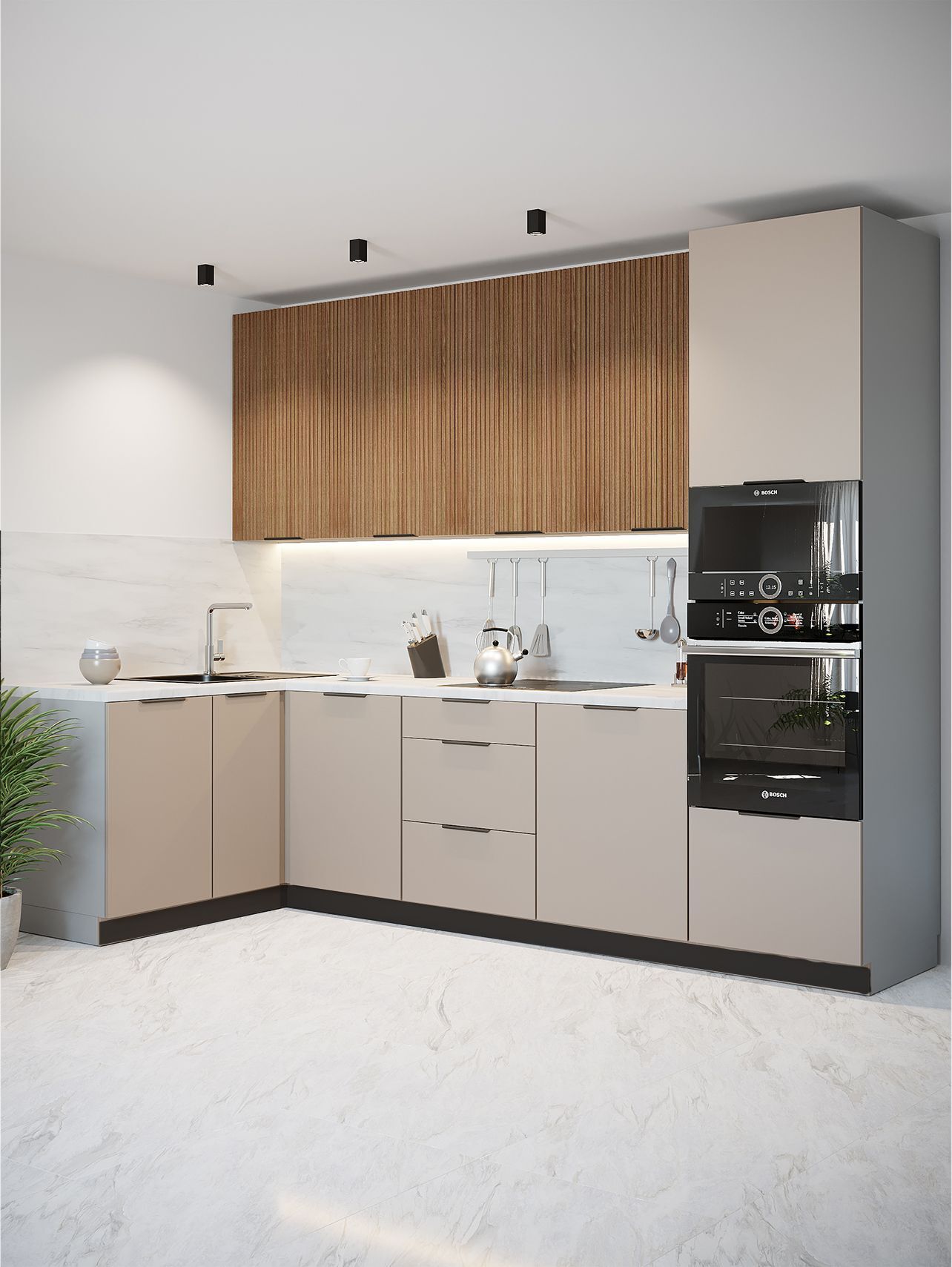 Кухня отличается своей универсальностью и практичностью. Она состоит из трех ярусов, что позволяет максимально эффективно использовать пространство и создает удобную рабочую зону для приготовления пищи.