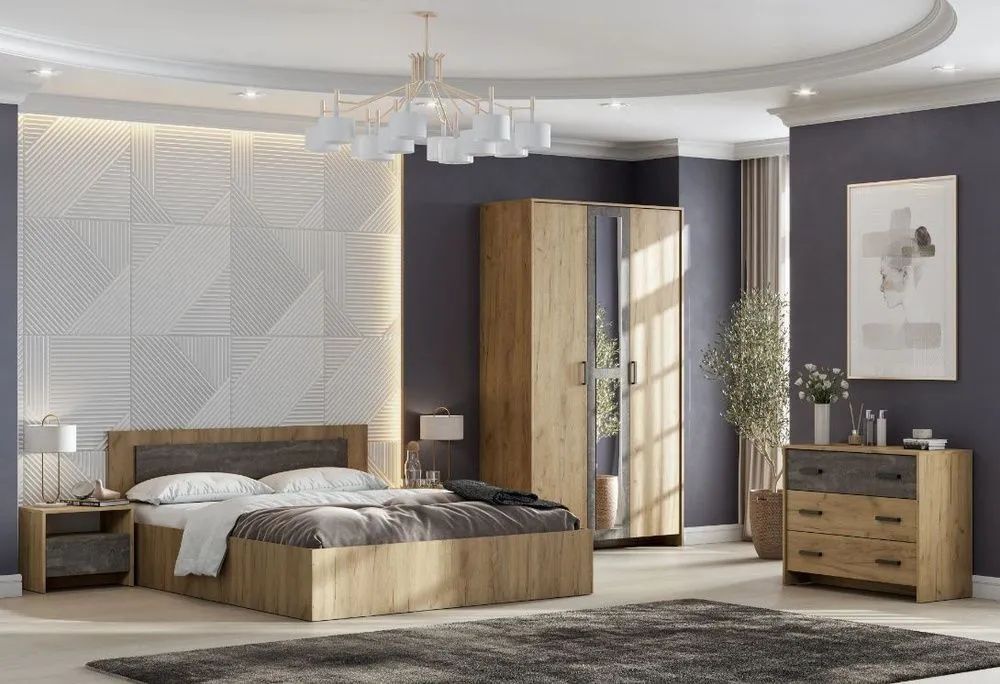 Спальный гарнитур Лофт - это идеальное решение для тех, кто хочет создать уютную и стильную атмосферу в своей спальне. Этот комплект состоит из кровати, тумбы, шкафа для одежды и комода, которые выполнены в едином стиле и цвете.