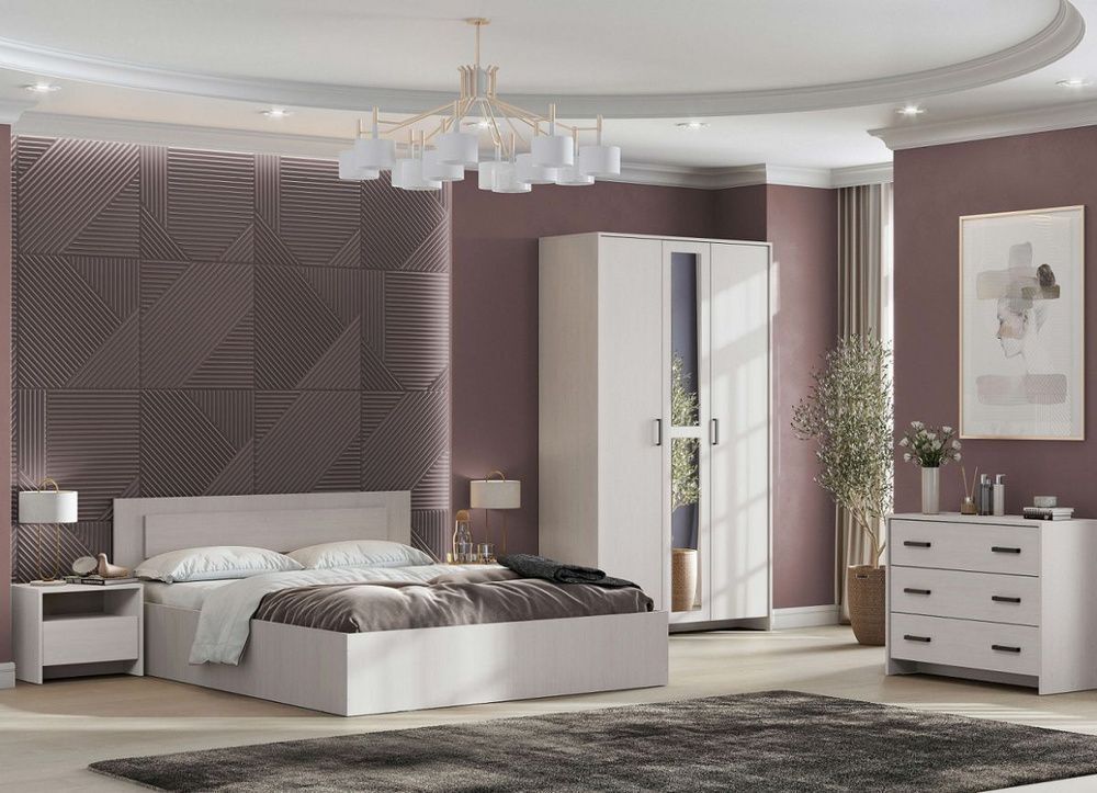 Тумба прикроватная обеспечивает дополнительное место для хранения вещей и украшений. Шкаф для одежды имеет три створки и зеркало, что делает его еще более удобным и функциональным. Комод с тремя ящиками позволяет хранить все необходимое в одном месте.