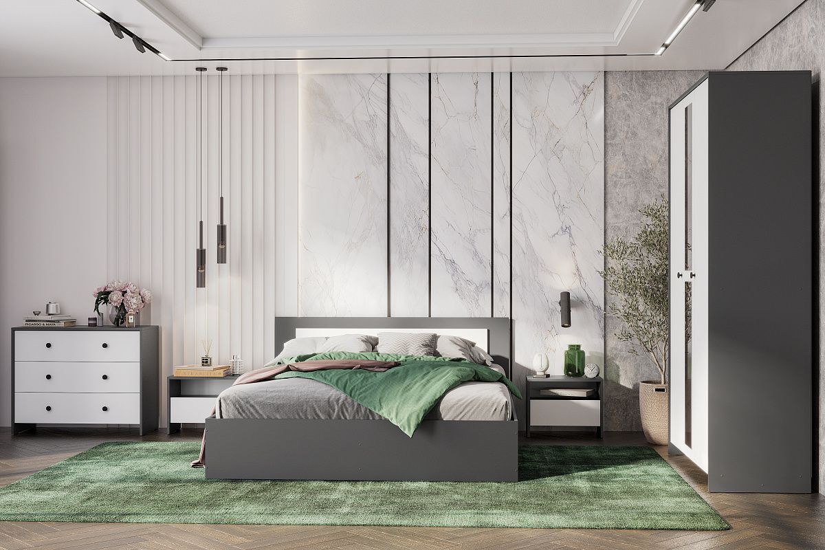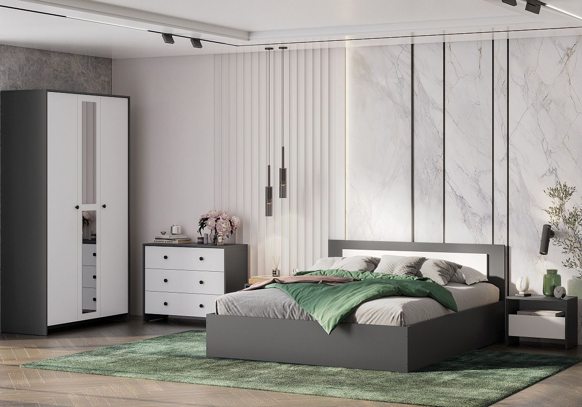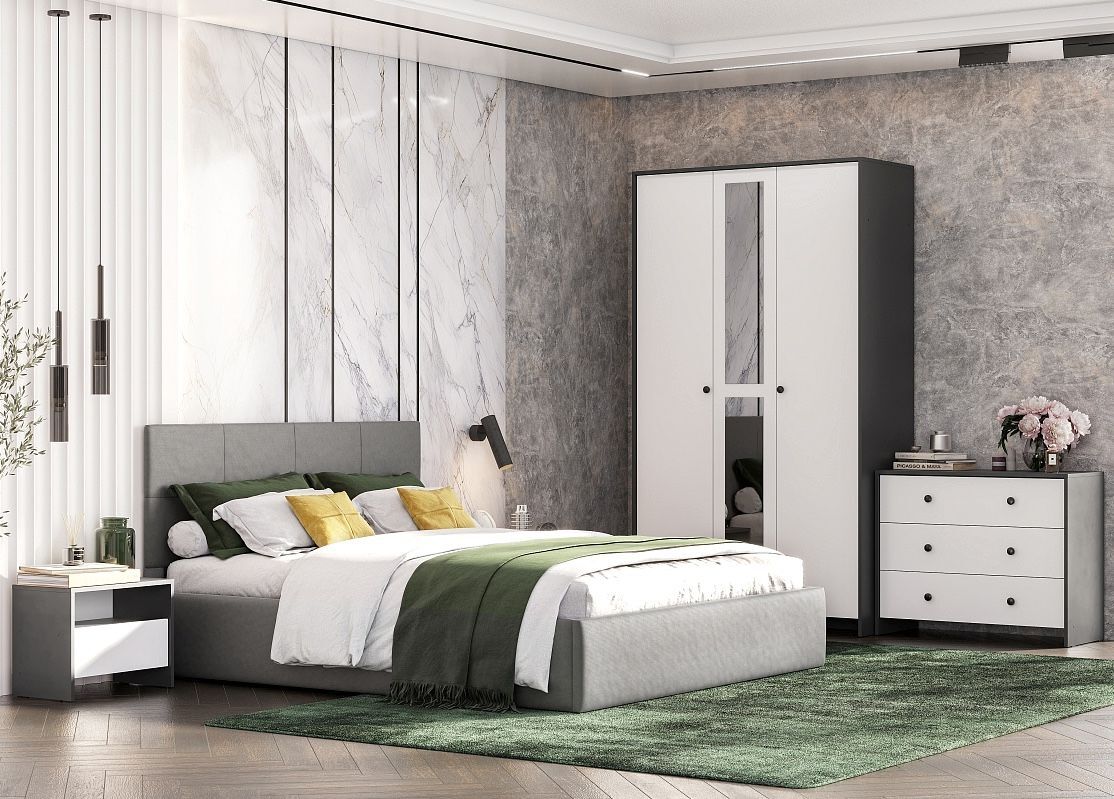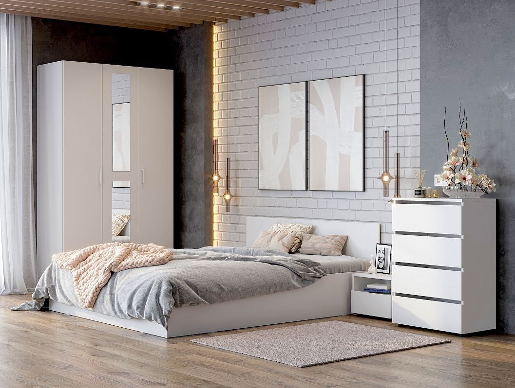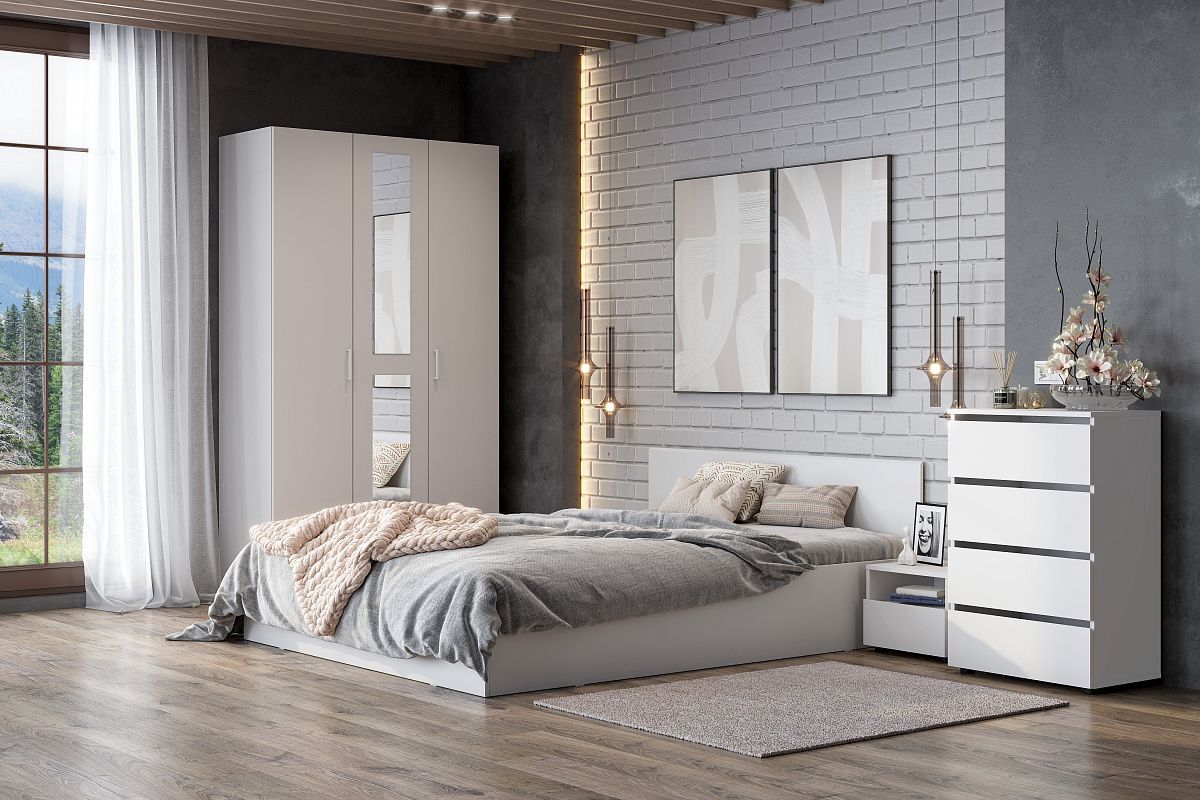 Спальный гарнитур ТК белый текстурный - это идеальное решение для тех, кто хочет создать уютную и стильную спальню. Этот комплект состоит из кровати, шкафа для одежды, комода и двух тумбочек, которые прикреплены друг к другу. Кровать имеет размер 160x200 см, что позволяет комфортно расположиться на ней. Шкаф для одежды и комод выполнены из дерева и имеют белую отделку, которая подчеркивает стиль лофт.